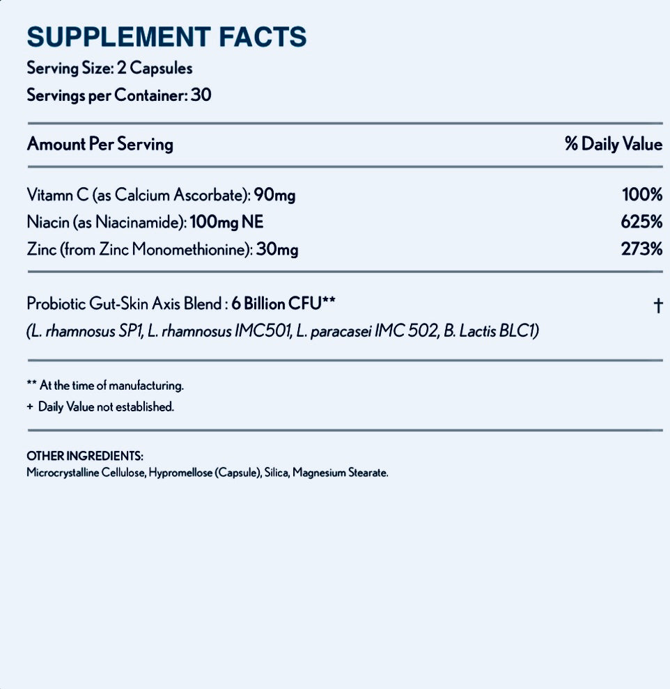 Zinc Monomethionine: helps with oil control, clearing skin, and supports immune health*Probiotic Gut-Skin Axis Blend: proprietary blend of 4 probiotics found to help support acne-prone skin, as well as support digestive health, support microbiome balance, and support overall gut health*